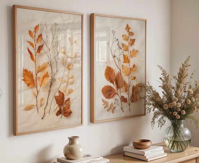 Walls set the emotional tone of a room. Art with natural motifs — like pressed leaf prints — brings softness and organic stillness. I love the idea of a pair of nature-inspired prints, neutral in tone, that echo the textures of the outside world while adding warmth indoors.